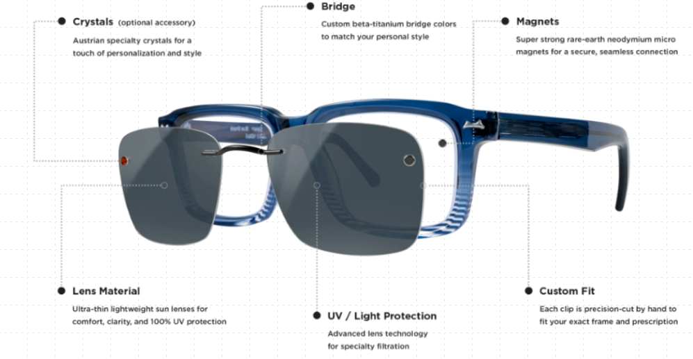 Chemistre eyewear is a fantastic solution for an easy clip-on sun lens, which includes a magnet in the corner of your lenses to snap on and off with ease. They are highly customizable and come with their own case, not only making them a fashionable choice but a practical one too!